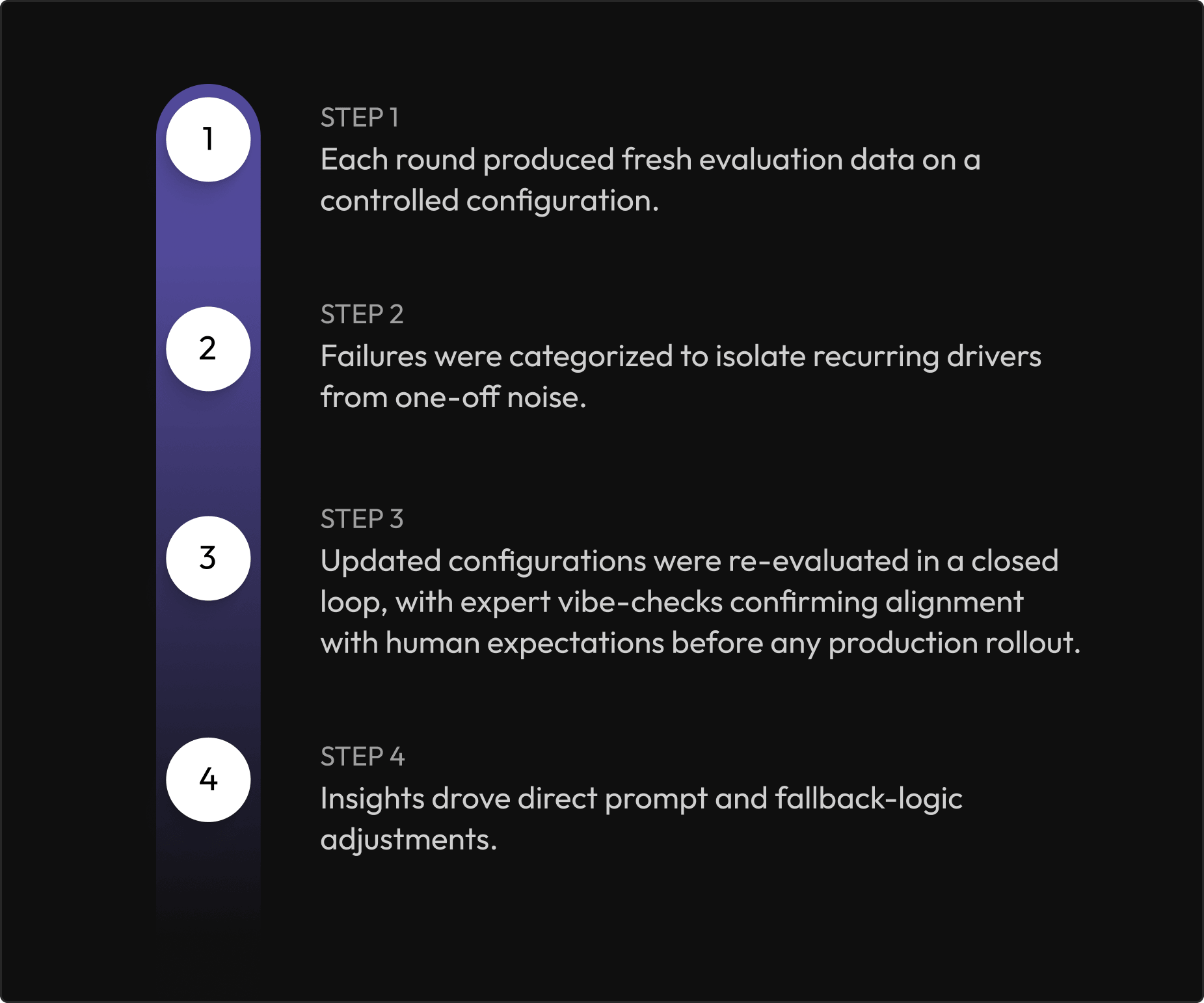 Weekly rounds combined with expert vibe-checks ensured improvements held up against real reviewer expectations, not just automated metrics.