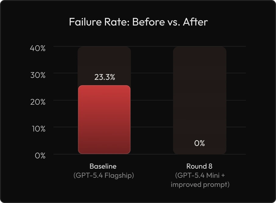 Every configuration change was anchored to measurable pass rates and dimension-level scores rather than intuition, making the case for the smaller model defensible on data.