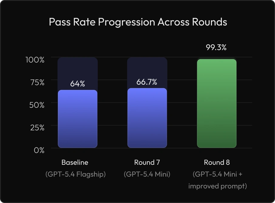 on Round 8 (GPT-5.4 Mini with improved prompt) across 148 evaluations, up from 66.7% in Round 7 and 64.0% on the flagship baseline.