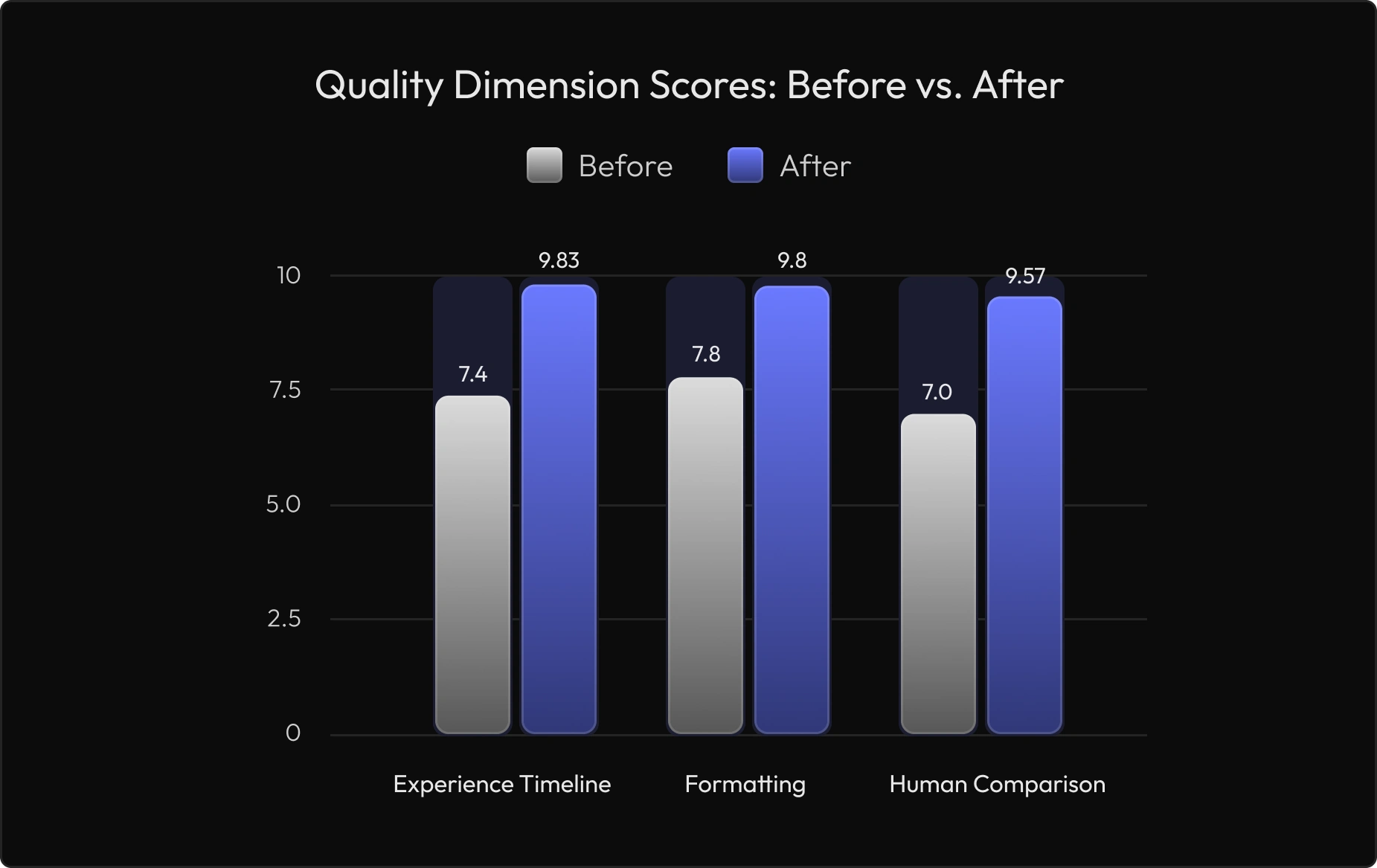 experience timeline scores moved from ~7.4 to 9.83, education timeline to 9.83, and formatting from 7.8 to 9.80.